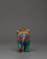 This finely carved Elephant Statue stands 9cm tall and 14.5cm wide and weighs 1.04kg. It is crafted from brass and artificial inlaid with turquoise and coral stones and adds charm and color to your sacred place or home decor. The upward-pointing trunk represents good fortune, protection, and positivity, making it a great ornamental piece for living rooms, workplaces, or meditation altars.