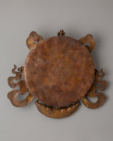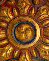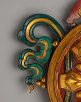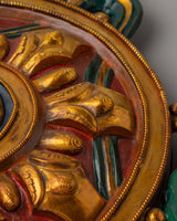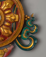 The meticulous craftsmanship of this Dharma Wheel shows its profound significance. The three fundamental elements, the hub, spokes, and rim represent ethics, knowledge, and concentration, which are all important features of Buddhist teachings. The intricately crafted hub represents discipline and mental stability, which are essential for meditation practice. The spokes signify the wisdom required to overcome ignorance, while the rim represents the unity of consciousness. The back of the piece features an exquisitely sculpted Bishwa Vajra, which enhances its sacred aura and makes it a special addition to your spiritual décor collection.