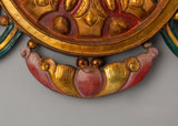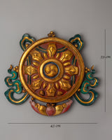 Enhance your house or sacred space with this gorgeous Dharma Wheel Wall Hanging, which is professionally handcrafted from copper with gold plated and painted with colorful acrylics. This magnificent piece stands 39 cm tall and 43 cm wide and weighs 2.75 kg, making it visually appealing and hefty. The precisely created Dharma Wheel has a circular form, representing the perfection of the Buddha's teachings, and a lotus flower base that adds elegance and deep spiritual resonance.