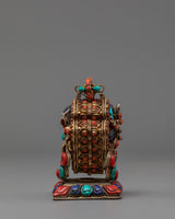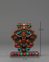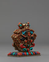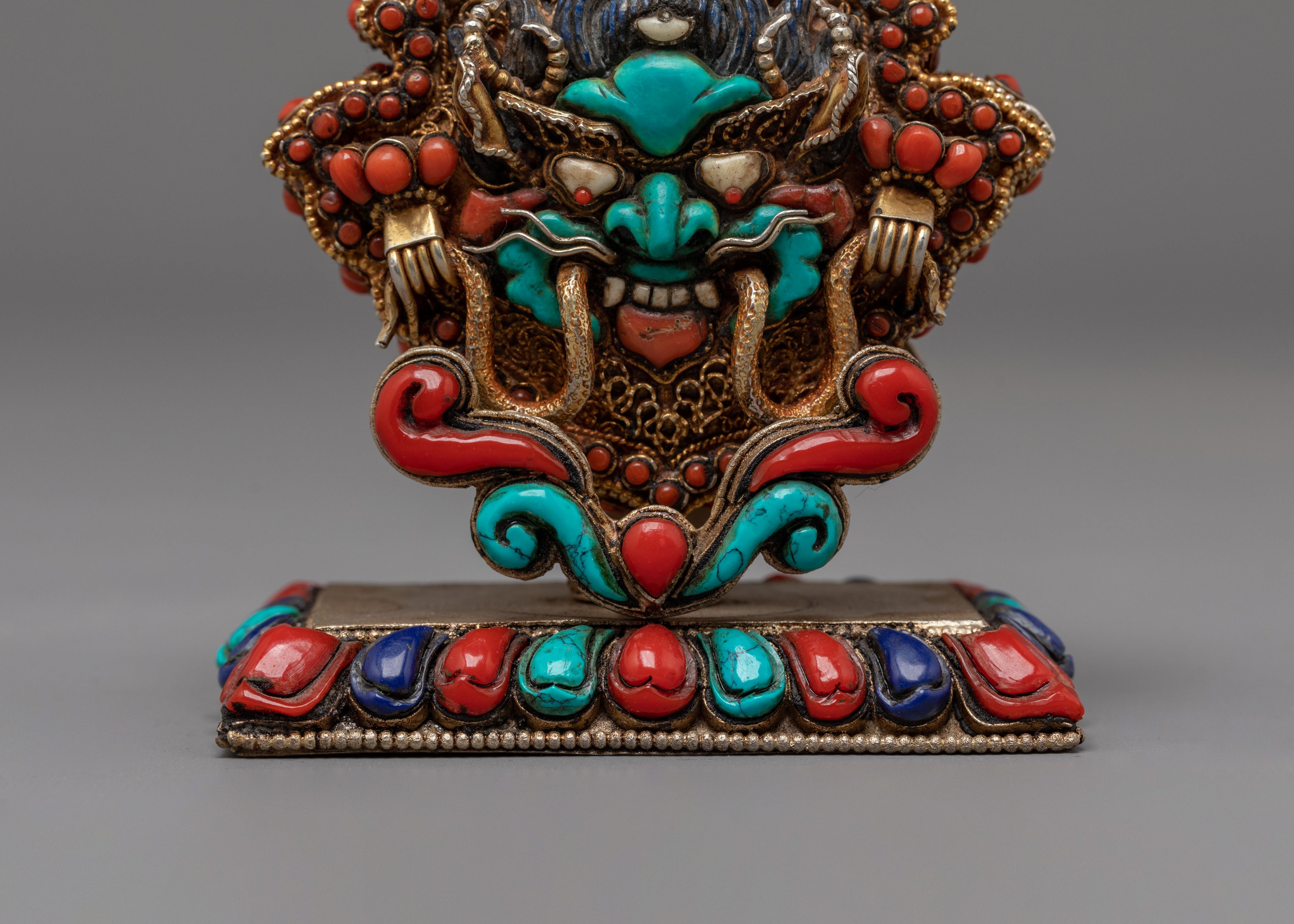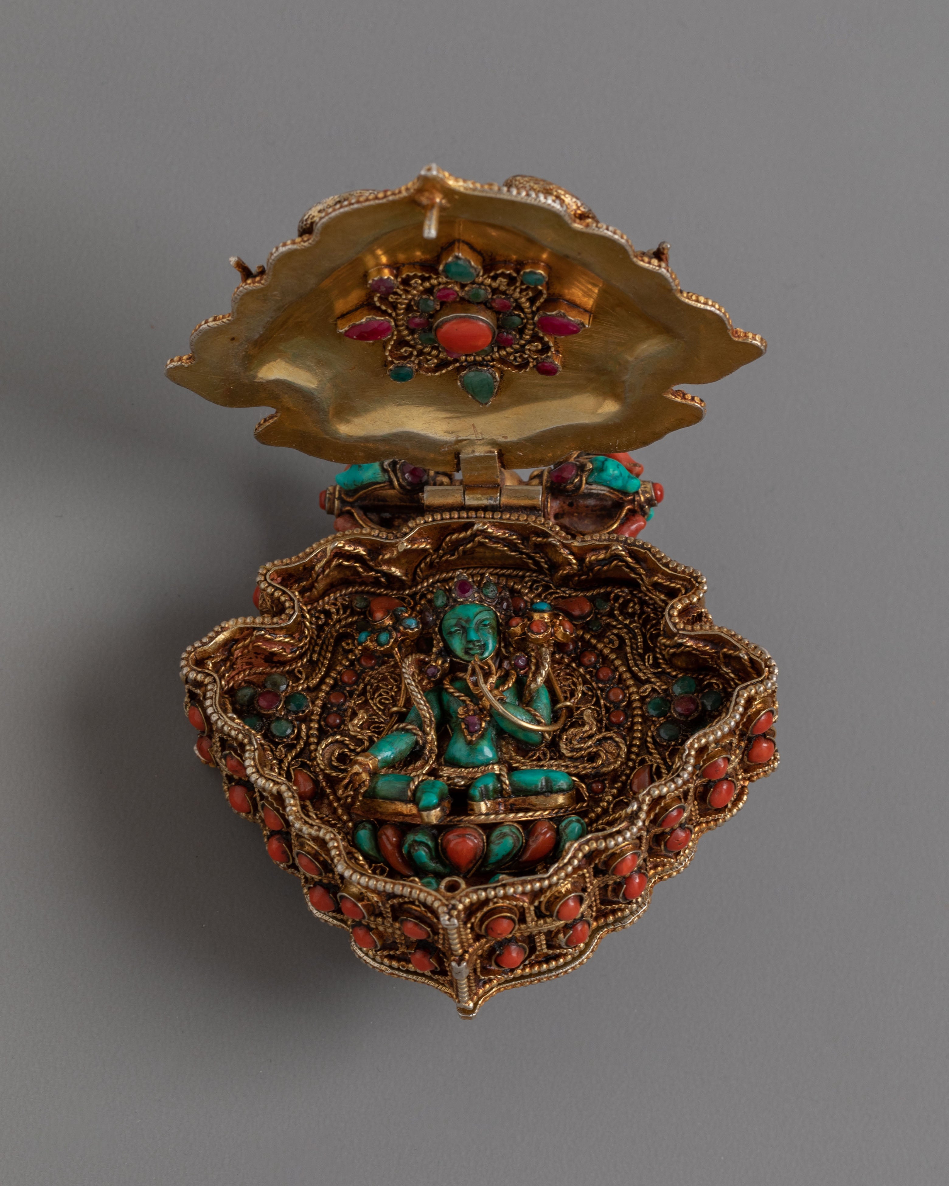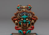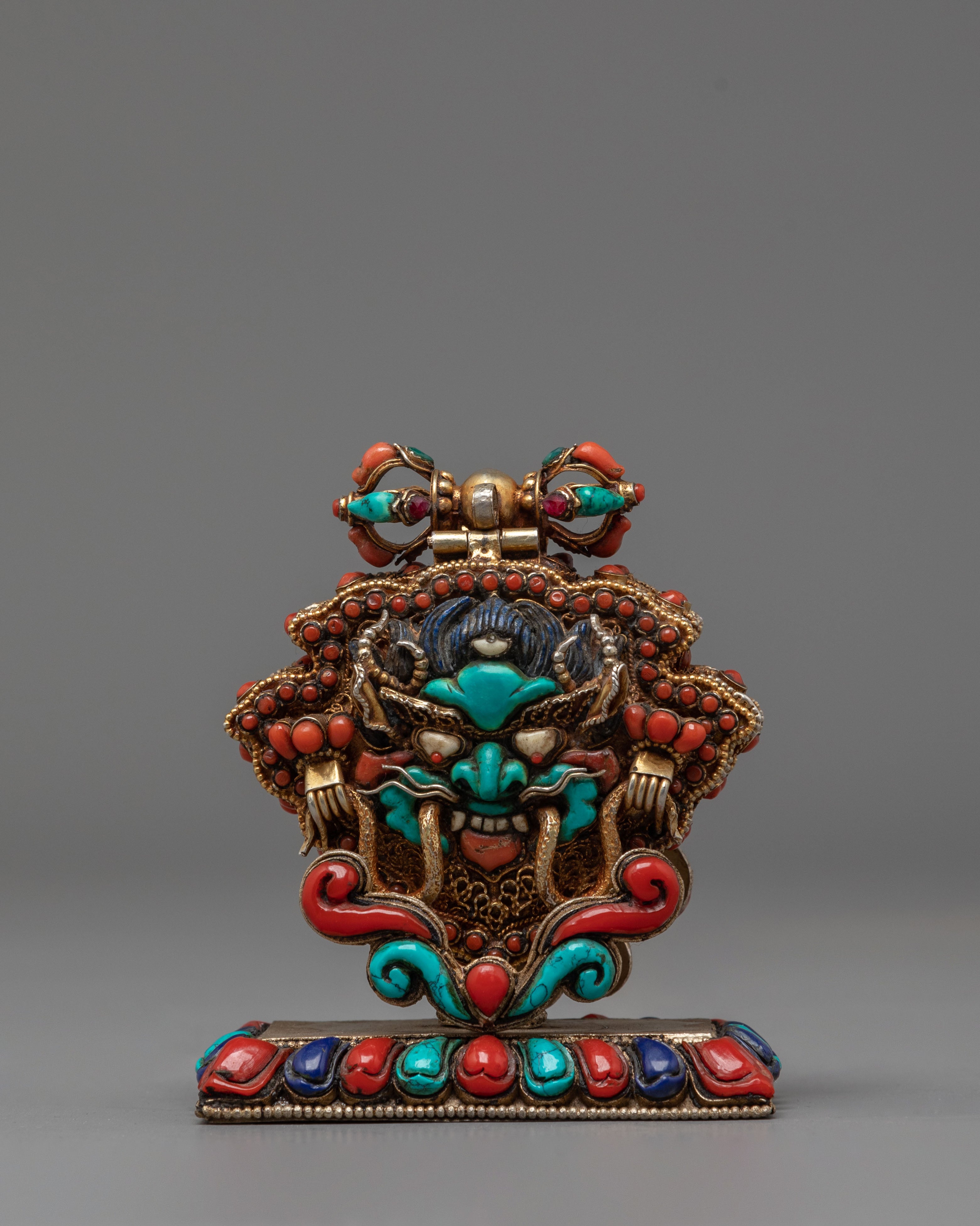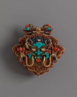 The Divine Bird Garuda Ghau Box is a majestic representation of protection and divine power in Tibetan Buddhism. This sacred amulet box is handcrafted from gold-plated copper and embellished with colorful coral, turquoise, and lapis lazuli stones. It depicts the majestic Garuda, the celestial bird deity known for overcoming hostile forces and symbolizing freedom and spiritual strength. Its elaborate design exemplifies both artistic mastery and profound spiritual connotation, making it an ideal piece for meditation rooms or personal altars.