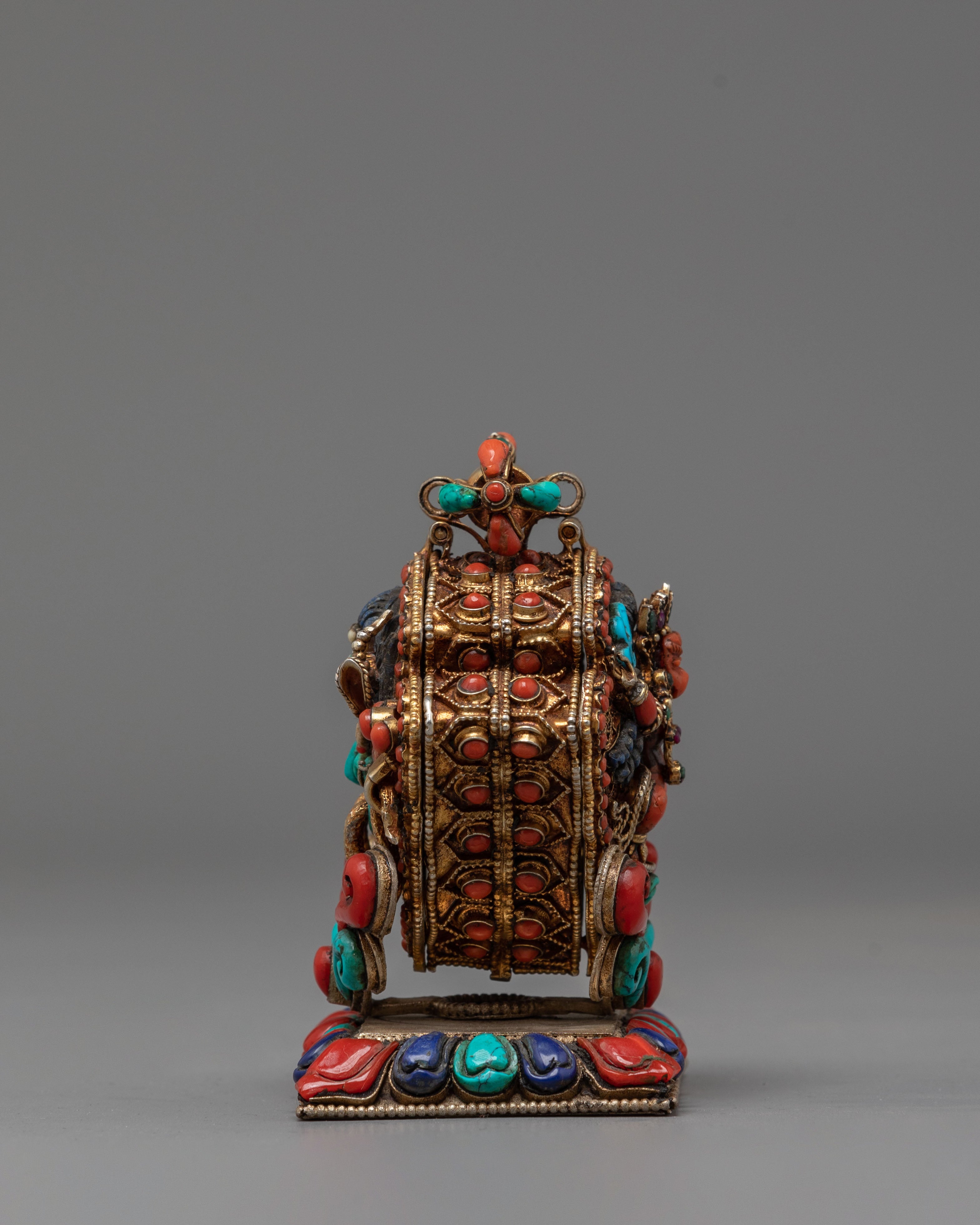 The front has a detailed image of Garuda with outstretched wings, exuding fiery force and sublime grace. The surrounding filigree patterns and multicolored stones add to its spiritual appeal, symbolizing the unification of earth, water, and sky elements. Coral and turquoise gems are inlaid in the bottom base and top crown, respectively, and are thought to provide the wearer with protection, healing, and positive energy. A Tibetan Ghau box is traditionally used as a portable shrine, containing sacred relics or prayers, providing constant blessings, and protecting the bearer while traveling or performing rituals.