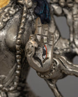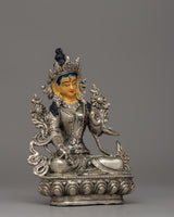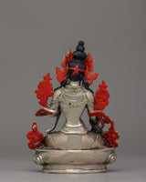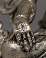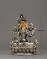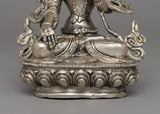 The statue is handcrafted with care from a copper body, then electro-silver plated to achieve a brilliant and elegant appearance. Applying acrylic paint brightens her facial features and decorations, increasing the overall visual attractiveness. Weighing 0.57 kg, it is lightweight, making it an ideal addition to personal altars or a lovely present for someone on their spiritual path. This piece's ageless craftsmanship and symbolic importance make it a must-have for practitioners and enthusiasts.