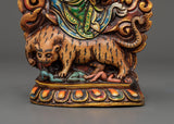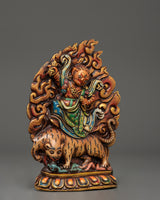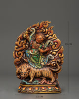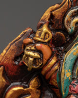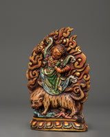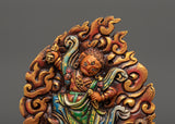 This Dorje Drollo wall hanging is a powerful Tibetan Buddhist protector deity made of finely wrought copper and brilliant acrylic colors. A manifestation of Guru Padmasambhava, Dorje Drollo symbolizes fierce wisdom, transformation, and protection. He is known for his wrathful form, which subdues negative energies, impediments, and ignorance while providing practitioners spiritual strength and emancipation.