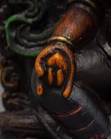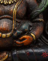 This Dzambhala for dharma statue, made of wood and painted with acrylic, portrays the deity with a fierce, wrathful expression, symbolizing his role as a protector and remover of obstacles. His intense appearance contrasts with his spiritual significance as the god of prosperity and abundance. Around his neck, he wears a utpala garland, representing his divine nature. He sits majestically on a Moon disc lotus base, with his posture reflecting strength and peace. He holds a citron fruit in his right hand, symbolizing prosperity, while his left hand holds a mongoose, representing wealth and the removal of misfortune.