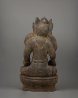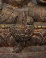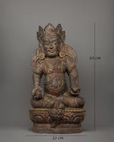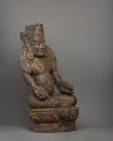 The Dzambhala, seated on a lotus base statue, stands 60 cm tall and weighs 5.38 kg. It is a magnificent wooden carving that embodies the powerful presence of the god of wealth. Seated gracefully on a lotus base, Dzambhala represents purity and spiritual enlightenment. He wears a five-jewel crown, emphasizing his divine nature, while his wrathful expression reflects his role in removing obstacles and dispelling negativity. His fierce expression and calm posture symbolize the balance between strength and serenity, reinforcing his protective qualities and ability to bring prosperity.