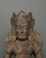 Dzambhala is a protective deity associated with wealth and prosperity. Many forms and traditions are associated with this wealthy deity, but he is usually depicted as yellow in color and holding a mongoose in his left hand. This statue has accurate traditional iconography and fine details.