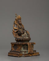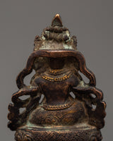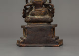 The Dzambhala Statue stands at 12 cm in height 9 cm in width, and weighs 0.42 kilograms. This magnificent copper statue, featuring a detailed antique finish, depicts Dzambhala, the Buddhist deity of riches, prosperity, and good fortune, seated upon the throne. Dzambhala is celebrated in the Buddhist tradition for his ability to grant both monetary abundance and spiritual success to his devotees, making this statue a practical addition to any religious setting.