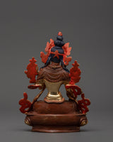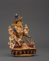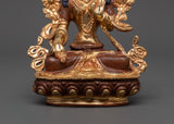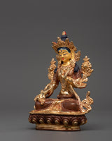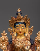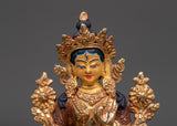 Embrace the calming presence of the Elegant Gold-Plated White Tara Statue, a handcrafted masterpiece that will bring spiritual peace to your home. This magnificent statue is 14.5 cm tall and 11 cm broad, made from oxidized copper and gold-plated to highlight its heavenly beauty. White Tara, the compassionate goddess of longevity and healing, is adored in Buddhist traditions for her ability to grant long life and protect against physical and emotional harm.