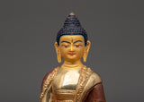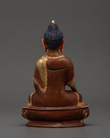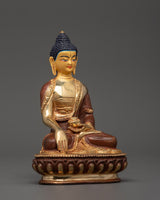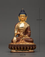 The Elegant Shakyamuni Buddha Statue is a handmade masterwork representing peace and enlightenment. This stunning statue, measuring 15.5 cm tall and 10.5 cm broad, is skillfully fashioned from oxidized copper and plated with gold, giving it a timeless and religious appearance. Shakyamuni Buddha, the historical Buddha and founder of Buddhism, represents the height of spiritual awareness and inner peace.