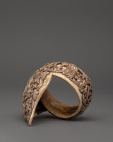 The intricate floral and animal designs evoke traditional Himalayan artistry, while the raised repousse work in pure silver embellishes each sacred emblem. This bangle, which is traditionally worn during rituals or kept on altars as a symbolic offering, also serves as excellent spiritual jewelry or an exceptional gift for enthusiasts of Eastern wisdom and sacred beauty.