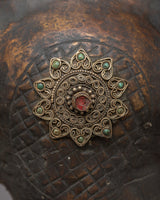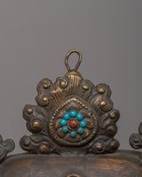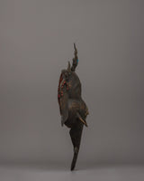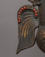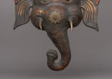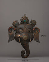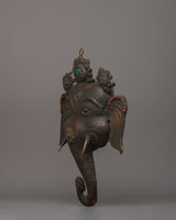 This Elephant-Headed Deity Mask honors Lord Ganesha, the god of wisdom, intellect, and new beginnings. The big elephant ears indicate deep listening and learning, and the third eye on the forehead denotes spiritual awareness and enlightenment. The magnificent oxidized brass details and embedded gemstones on the extravagant crown add to the mask's divine atmosphere, making it a stunning spiritual decor item. The curving trunk represents adaptation and strength, encouraging perseverance and success in all pursuits. Placing this sacred god mask at your house, temple, or workplace is thought to provide prosperity, positive energy, and heavenly protection.