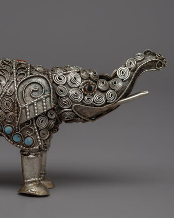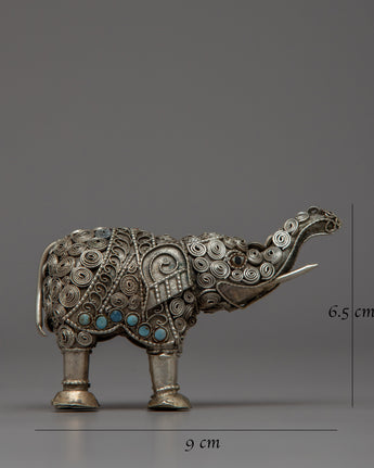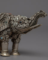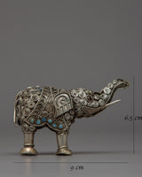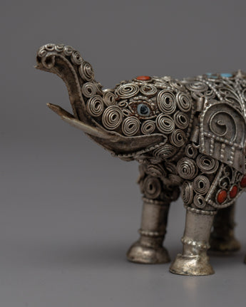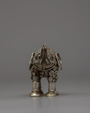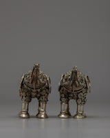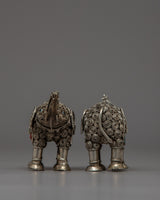 Presenting the Elephant Statue Set, an exquisitely crafted collection that perfectly captures the grace and power of these magnificent elephants. Each piece in this set has a copper body that has been painstakingly decorated with white metal accents and lavishly plated in silver. The elaborate craftsmanship brings out the inherent beauty and significance of elephants, which are valued as symbols of strength, wisdom, and good fortune in many civilizations.
