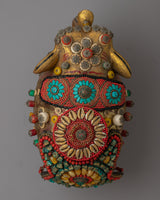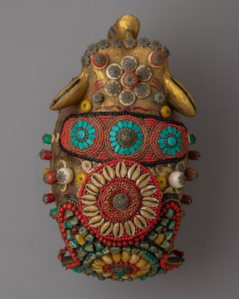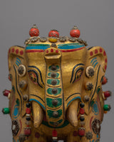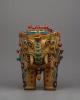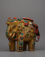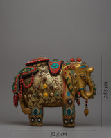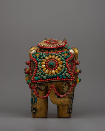 Presenting the Elephant Wood Statue, a masterfully handmade object that radiates beauty and majesty. This gorgeous statue is made of wood, has ornamental stones on it, and measures 28.5 cm in height by 32.5 cm in width. It weighs a massive 3.41 kg. The majesty and grace of the elephant, which is revered in many cultures as a sign of luck, strength, and wisdom, are captured by the fine craftsmanship and intricate details.