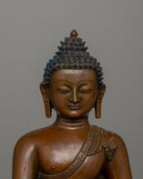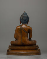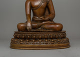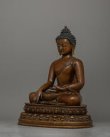The copper body's oxidation process gives the statue a beautiful, earthy finish, creating a warm, aged appearance that highlights the artist's craftsmanship. The Buddha's calm and centered demeanor, reflected in his peaceful countenance and seated pose, encourages reflection and serves as a reminder of Shakyamuni's spiritual enlightenment. The richly textured base adds a sense of grounded stability to the piece, supporting the Buddha in his meditative state while emphasizing the timeless nature of his teachings.