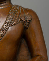 The Enlightened Shakyamuni Buddha statue, made of oxidized copper, is an impressive representation of one of Buddhism's most revered figures. Standing 43 cm tall and 35 cm wide, it captures the Buddha's serene presence in his meditation posture. The intricate details in the folds of his robe are expertly carved, and his calm expression conveys a sense of profound wisdom and inner peace. His right hand is in the earth-touching Mudra.