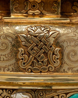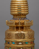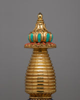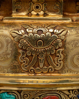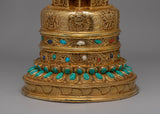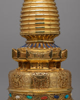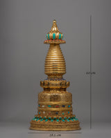 The stunning Buddhist Stupa with Coral is a work of spiritual creativity and devotion. It stands 60 cm tall and 28.5 cm broad, with a copper body embellished with elaborate gold plating and colorful coral, turquoise, Conch, and lapis lazuli inlay art. Weighing 10.48 kg, this significant item effectively symbolizes Buddhist teachings, enlightenment, and spiritual peace. It is ideal for sacred altars, meditation rooms, or as a focal point in any spiritual setting. It embodies both beauty and objectivity. Colorful stones make this Tibetan stupa more attractive and meaningful Since each has