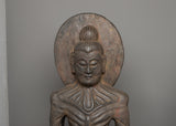 This hand-carved wooden Fasting Buddha statue is 89cm tall and depicts the serene beauty of Buddha on his meditative journey. The statue, carved with meticulous attention to detail, emphasizes the Buddha's distinctive skeletal features, indicating his commitment to fasting and reaching enlightenment. This depiction of the Buddha is very spiritually significant, portraying his inner strength, discipline, and the transformational force of ascetic practices in Buddhist thought. The delicate workmanship evokes a sense of peace and dedication, making it an ideal addition to any meditation place or holy space in your house.