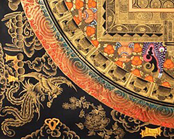 In the Medicine Buddha Mandala Thangka, the Medicine Buddha is at the center, surrounded by a complex arrangement of symbols, and geometric patterns. This mandala serves as a visual aid for meditation and spiritual contemplation, symbolizing the healing and transformative energy of the Medicine Buddha's teachings radiating outward to benefit all beings. It's a visual representation of the interconnectedness of healing, wisdom, and compassion in both the inner and outer worlds.