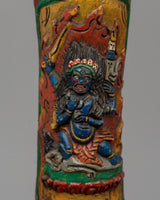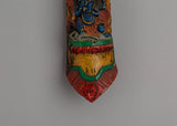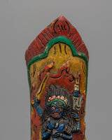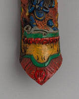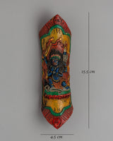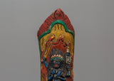 An exquisite representation of Himalayan skill, this hand-carved Four Armed Mahakala Buffalo Bone Apron symbolizes the transformational and protective power of the Citipati, the Tibetan Buddhist Lord of the Cemetery. The powerful and protective god is brought to life by the colorful acrylic paint on this beautifully crafted apron, which stands 15.5 cm tall and is surrounded by flames that represent spiritual development.