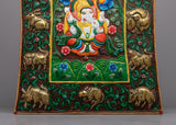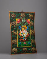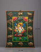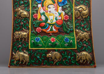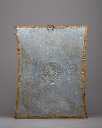 A metal thangka is a type of thangka painting that is made on a metal surface rather than on traditional canvas or paper. Metal thangkas are often made using copper, brass, or silver and are usually decorated with intricate designs and Buddhist iconography using a technique called repoussé. This involves hammering the metal from the reverse side to create a raised relief image on the front. Metal thangkas are known for their durability and are often used in ritual contexts or as decorative pieces in Buddhist homes and temples. They are particularly common in Tibet, where they have been produced for centuries.