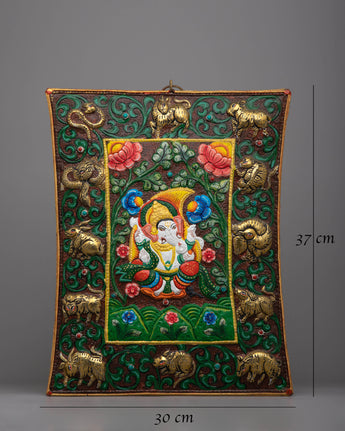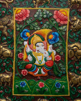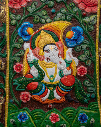 This Ganesh wall hanging, which is 30 cm wide and 37 cm high, looks striking wherever it is put on display. The deity is brought to life with vivid hues by the acrylic coloring, which also gives a sense of elegance and sophistication to the piece.