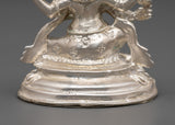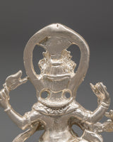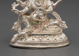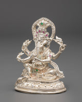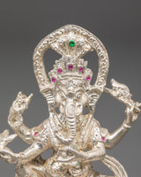 This Ganesh Statue with Ganesha Mudra is a stunning handcrafted work of spiritual art made of 98% silver. Standing 7.5 cm tall and 5.5 cm wide, this statue powerfully portrays the Hindu God of Prosperity and Wisdom, ideal for boosting your spiritual altar decor or meditation area. Ganesh is represented holding his trunk and hands in Ganesha Mudra, which means blessings, protection, and the elimination of obstacles. He carries an axe, mala beads, and a tusk, each representing the destruction of evil forces, spiritual practice, and the power to conquer obstacles. The lotus image represents purity, enlightenment, and the sacred force of a new beginning. Ganesh also wears a crown exquisitely etched with gemstones, which enhances the statue's divine aura.
