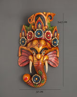 This gorgeous hand-carved wooden Ganesh wall hanging is a masterwork that symbolizes knowledge, wealth, and the elimination of obstacles. Lord Ganesha is widely adored in Hindu and Buddhist faiths as the God of beginnings and success. Measuring 54.5 cm in height and 30 cm in breadth, this mask is made of wood and carefully hand-painted with stunning acrylic shades. It is ideal for meditation spaces, temple altars, or sacred home décor.