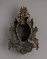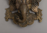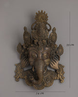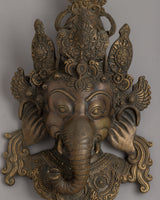 This artistically sculpted Ganesha mask depicts the elephant-headed deity with enormous ears that symbolize profound listening and wisdom, as well as an elegantly curved trunk that represents adaptation and strength. His elaborate headgear, embellished with intricate patterns, represents heavenly knowledge and protection. The oxidized brass finish adds to its historic appeal, making it great for spiritual home decor, temple ornaments, or meditation room centerpieces. Ganesha's presence is thought to confer wisdom, success, and prosperity, therefore this handcrafted wall mask is an effective Vastu and Feng Shui element for spiritual well-being.