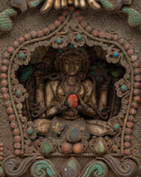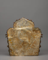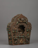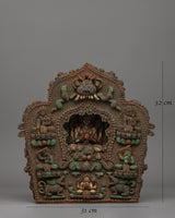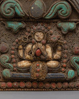The Chenrezig Ghau Box is a revered Tibetan treasure elegantly crafted from copper and electro gold plating and embellished with brilliant turquoise and coral gemstones. This big amulet box, 32 cm tall and 31 cm wide, is a portable shrine or altar centerpiece dedicated to Chenrezig (Avalokiteshvara), the embodiment of compassion in Tibetan Buddhism. Whether used to keep relics, pray, or as a focal point for offerings, it adds a profound spiritual presence to any sacred setting.