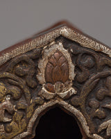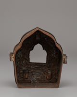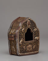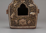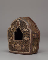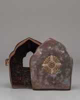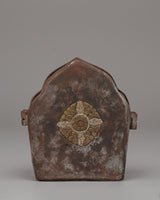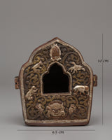 Tibetan Brass Ghau small Prayer Box is a sign of spirituality and protection that practitioners frequently use to transport sacred relics, mantras, or miniature deities. With a tiny size of 10 cm in height and 9.5 cm in breadth, it is an ideal travel companion for meditation or religious ceremonies. The delicate silver and brass inlays mirror traditional Tibetan workmanship, making this both a utilitarian and beautiful piece of art.