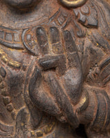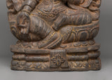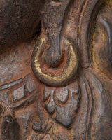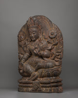 This goddess of compassion Green Tara sculpture, crafted from wood, stands 62.5 cm tall and 42.5 cm wide, radiating compassion and divine grace. She wears a five-jeweled crown, symbolizing her enlightened state, and is seated on a lotus base, a sacred symbol of purity and wisdom. Her serene expression conveys peace and spiritual presence, while the detailed craftsmanship brings her divine essence to life. Her right leg extends outward, symbolizing her readiness to step into the world and help those in need, a defining trait of Green Tara’s compassionate nature.