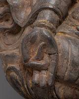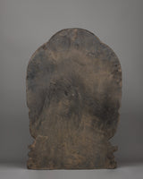 Her throne is a masterpiece of artistic design adorned with intricate floral carvings and a double vajra at its base, symbolizing spiritual power and indestructibility. The fine detailing enhances her strong yet nurturing energy, creating a harmonious balance of protection, peace, and divine support. With its graceful yet commanding presence, this Green Tara sculpture is a powerful symbol of wisdom, compassion, and spiritual guidance for all who encounter it.