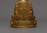 The representation of Amitabha Buddha has profound spiritual significance. Seated in Dhyana Mudra (meditation gesture), his peaceful admire exudes tranquility and wisdom. The exquisite gold plating adds to his sacred aura, and the elaborate craftsmanship on his robe and seat emphasizes his function as a celestial guide to enlightenment. Amitabha is said to guide devoted practitioners to Sukhavati, the Pure Land, where they might achieve total freedom and enlightenment. This revered statue symbolizes inner light, attention, and the path to waking.