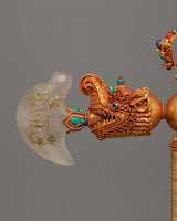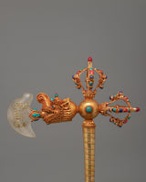 A handmade Kartika Vajra axe with a copper body and gold plating is decorated with turquoise, coral, and crystal inlays that add to its aesthetic and spiritual appeal. The axe's shape resembles a crystal blade, and sacred writing is engraved. The exquisitely crafted vajra hold symbolizes indestructibility and heavenly might. This significant artwork, which measures 40.5 cm in height and 11 cm in breadth, is perfect for an altar display, ritual use, or as an artifact for Buddhist practitioners.