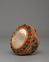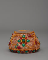 This gorgeous item has a copper body professionally gold-plated and embellished with turquoise and faux coral stones. The bowl is surrounded by elaborate patterns of detailed filigree work, representing Himalayan artists' exquisite craftsmanship. This ceremonial bowl is a beautiful piece of décor and a sacred object due to its vibrant colors and spiritual symbolism. Use it to decorate your shrine, for ceremonial purposes, or as a heartfelt present for Buddhists or other spiritual people.