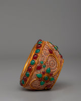 With its exquisite design, including glowing coral and turquoise stones, this handcrafted gold-plated copper golpa with coral will elevate your spiritual environment. The Golpa is a sacred vase used for centuries in Tibetan Buddhist ceremonies to store offerings like rice, holy water, or sacred ingredients. Its striking gemstone embellishments and graceful shape make it a potent focal point for your altar or meditation area.
