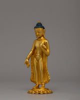 Standing 12.5 cm tall, this exquisite gold-plated Dipankar Buddha statue is one of the first Buddhas to foretell the arrival of Shakyamuni Buddha. This standing figure, which was sculpted from a copper body and exquisitely electroplated, represents elegance, spiritual foresight, and eternal peace. Its 0.25 kg weight suits your altar, holy shelf, or meditation area. It serves as a daily reminder of the enduring nature of enlightenment.