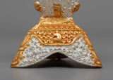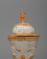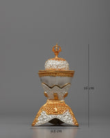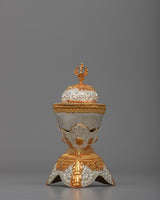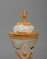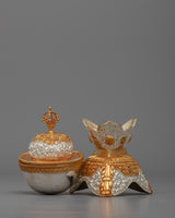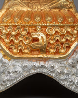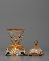 This beautiful Kapala set is handcrafted with a copper body, then plated with gold and silver to give it an exquisite finish. The set, standing 16 cm in height and 9.5 cm in width, features intricate detailing that adds a spiritual and regal touch to any space. The Kapala is a ritualistic bowl used in Tibetan Buddhist ceremonies, often for holding offerings, and is deeply symbolic in spiritual practices. The elegant gold-plated base and silver-plated bowl evoke a sense of reverence and dedication to the rituals they are used for.