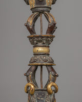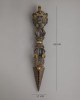 The Phurba, or ritual dagger, is a powerful Tibetan Buddhist instrument linked with Vajrakilaya, the furious deity who eliminates obstructions and negativity. This 56 cm tall, 12 cm broad Phurba is skillfully carved from oxidized copper and embellished with gold and silver plating, giving it an ancient and spiritual aura. At 3.41 kg, this significant sculpture is ideal for serious practitioners, collectors, and altar decorations.
