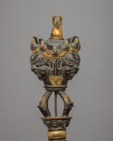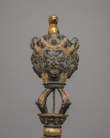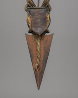 The three-sided blade, adorned with elaborate decorations, reflects the cutting through of ignorance, desire, and hatred, deity at the top signifies wisdom and enlightenment. This Phurba, which is used in Tantric rituals, meditation, and spiritual protection, is more than just an item; it is an energy tool for transformation and protection from negative forces. Whether used in ritual or as a magnificent decorative spiritual artifact, this handcrafted Phurba has profound symbolic and energetic importance.