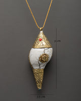 This gold-plated spiritual conch shell locket is intended to be more than simply an ornament; it is a symbol of inner serenity and security. It is 9cm tall and 3.5cm wide, made of conch shell, gold-plated, and embellished with a delicate floral carving and a brilliant coral stone. In Buddhist traditions, the conch shell signifies the divine sound and spirituality. It has been gracefully turned into a necklace that can be worn daily or saved as a spiritual remembrance. This locket also has intricate flower carvings, contributing to its elegance and spiritual value.