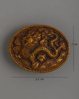 This gold-plated Tibetan dragon buckle, handcrafted from copper, represents power, protection, and wisdom. This intricate item reflects traditional Tibetan work of art. This lightweight yet buckle is 7 cm in height and 5.5 cm in width and weighs only 0.046 kg, making it an ideal complement for ceremonial belts, spiritual decor, or as a collector's piece.
