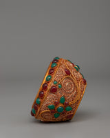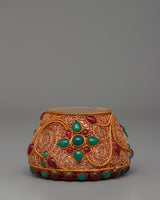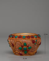 Presenting a stunning gold-plated Tibetan Golpa bowl that has been carefully created by hand, featuring a copper body and embellished with vivid imitation coral and blue stones. In Tibetan Buddhist ceremonies, this offering bowl, with its elaborate gold-plated filigree work, is a revered representation of dedication and wealth. It is frequently utilized as a decorative element on home altars or during offerings and exudes artistic and spiritual value. The striking contrast of coral and turquoise with the gold-plated foundation brings your sacred area into harmony and balance.