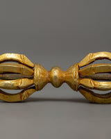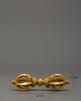 This Vajra weighs 0.090 kg and is 3.5 cm tall by 10 cm long. It is expertly made of copper and gold-plated for an elegant look. This artifact's profound spiritual importance is reflected in its exquisite craftsmanship, which makes it an ideal addition to ritual ceremonies, meditation altars, or as a symbolic piece of décor. This Vajra represents power, enlightenment, and knowledge and can be used for Tibetan Buddhist practices, mantra recitations, or as a significant spiritual present.