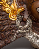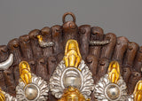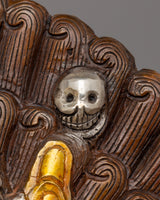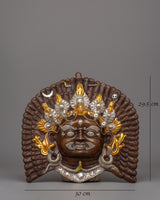 The mask's delicate details are highlighted by the elaborate gold and silver plating that adorns its copper body. Surrounded by symbolic elements such as skulls, serpents, and divine patterns, Bhairav's driven expression embodies both traditional artistry and spiritual meaning. This mask is a spiritual and artistic treasure since every detail is carefully hand-carved.