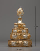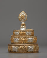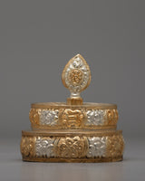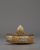 This mandala set exudes elegance and classic style because of its copper base and elaborate gold and silver plating. Each tier's intricate carvings represent harmony and connection, making them a powerful tool for ritual offerings and meditation. This sacred artifact is ideal for those who practice Buddhism, are interested in spirituality, or are interested in collecting meaningful décor. This mandala offering set embodies commitment and artistry, whether used in daily rituals or as an attractive decor piece.