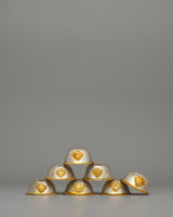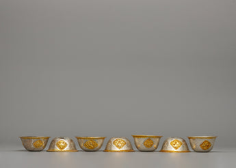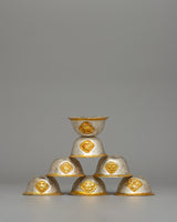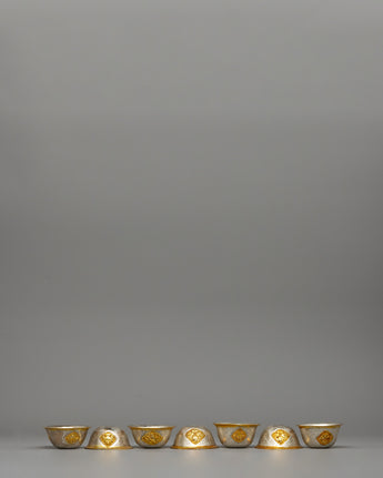 This set of gold and silver-plated Tibetan offering bowls will add a touch of sacred elegance to your spiritual area. Each bowl is perfectly crafted, measuring 3 cm in height, 7 cm in diameter, and 3 cm in inner depth. These bowls, made of copper and electroplated in gold and silver, display beautiful craftsmanship and spiritual meaning. Due to their lightweight design (single bowl: 0.032 kg; whole set: 0.240 kg), they are ideal for altar decoration and daily rituals.