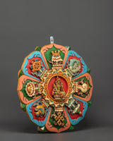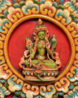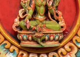 This handcrafted Green Tara wall hanging is an exquisite depiction of the revered Buddhist deity recognized for her compassion, protection, and prompt assistance in times of need. This sacred artwork, beautifully carved from high-quality wood and coated in brilliant acrylic colors, makes an excellent focal point for meditation spaces, yoga studios, or spiritual home decor. Its height and width are 48.5cm, making it a striking and meaningful addition to any religious or ornamental space.