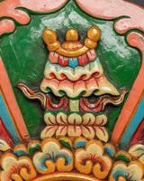 This intricately sculpted Green Tara wall piece weighs 2.18kg and displays the rich artistic tradition of Tibetan Buddhist handicrafts. Green Tara is honored as the Mother of Liberation, representing active compassion and wisdom. The intricate carving and acrylic colors bring her divine presence to life, making it an excellent spiritual present or a powerful addition to any Buddhist altar or sacred area. It is ideal for individuals seeking protection, direction, and inner tranquility in everyday practice.