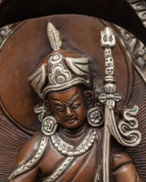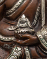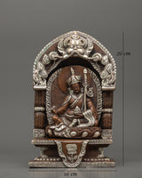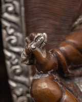 This magnificent Guru Padmasambhava Tantric Master Sculpture captures the legendary knowledge and strength of Guru Padmasambhava, an essential figure in Tibetan Buddhism. This 26 cm tall statue, made of oxidized copper and silver plating, depicts the master in a meditative stance, with detailed workmanship that emphasizes the figure's spiritual energy and heavenly aura. The sculpture is 16 cm in width and weighs 3.09 kg, making it a visually appealing and significant addition to any altar or spiritual area.
